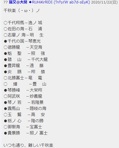 - このサイト「大相撲星取表」の管理人である「gans」は、こちらでは「猫又」として参加しています。
